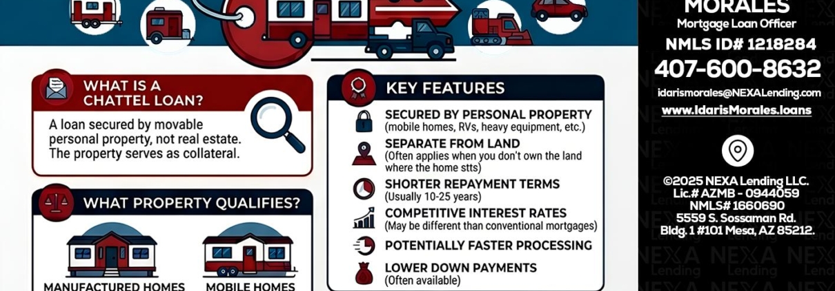 Hi, my name is Idaris Morales. I’m a Loan Officer offering personalized mortgage solutions, fast customized quotes, great rates and service with integrity. If you’re interested in learning more about the Chattel loan or any other, just let me know and I’ll walk you through your options.